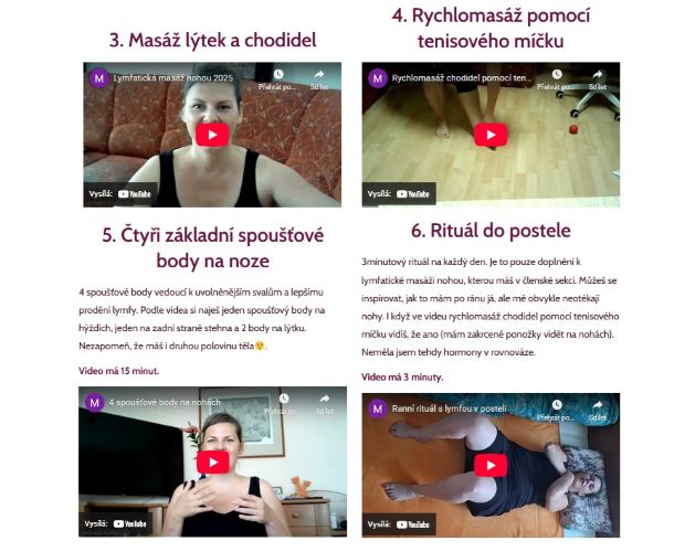 Trápí mne těžké a oteklé nohy a je to dost nepříjemné. Zkoušela jsem i lymfo masáže, ale nemohu docházet příliš často. Míša ve videu vše skvěle vysvětluje, mile, pomalu a jasně. Jsem nadšená a už první pocity mne uklidnily, že to s otoky nohou zvládnu. Konečně jsem našla způsob a mohu si sama pomoci.